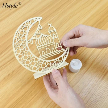 Hstyle EID Mubarak Wooden Pendant with LED Candles Light Ramadan Decorations for Home Islamic Muslim Party Decor Kareem Ramadan