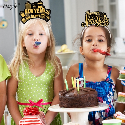6 uds Feliz Año Nuevo diadema Tiara negro oro Año Nuevo decoraciones Año Nuevo diademas para mujeres NYE decoraciones de fiesta SD2039