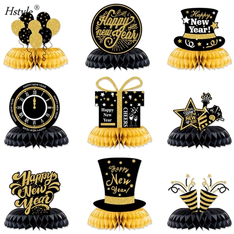 9 Uds. Centros de mesa de nido de abeja de Feliz Año Nuevo 2024 suministros de fiesta de Año Nuevo Oro Negro Decoración de mesa de fiesta de Año Nuevo SD2028