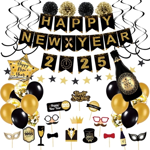 Suministros para fiestas de Nochevieja 2025 Feliz Año Nuevo, pancarta de oro negro, conjunto de globos, accesorios para fotos de Año Nuevo, remolinos colgantes, decoraciones para fiestas