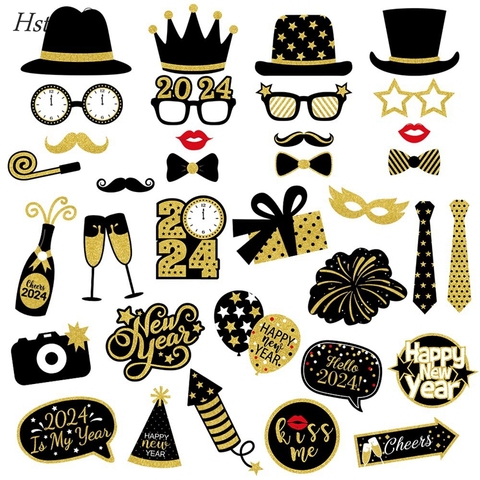 Engraçado Ouro Glitter Feliz Ano Novo 2024 Partido Photo Booth Props Kit Véspera de Ano Novo Cartão de Festa Máscaras Decorações SD2757
